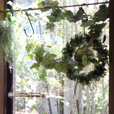 花材だけでなく、鏡やガラスやアイアンなどの雑貨と組み合わせたり、クラシカルなリボンやレースを取り入れたりしながら、バリエーション豊かな作品を生み出せればと日々思いながら作品作りに励んでおります。